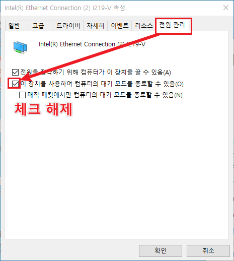 여기서 '이 장치를 사용하여 컴퓨터의 대기 모드를 종료할 수 있음(O)' 속성을 체크해제한 후 확인 버튼을 누른다.